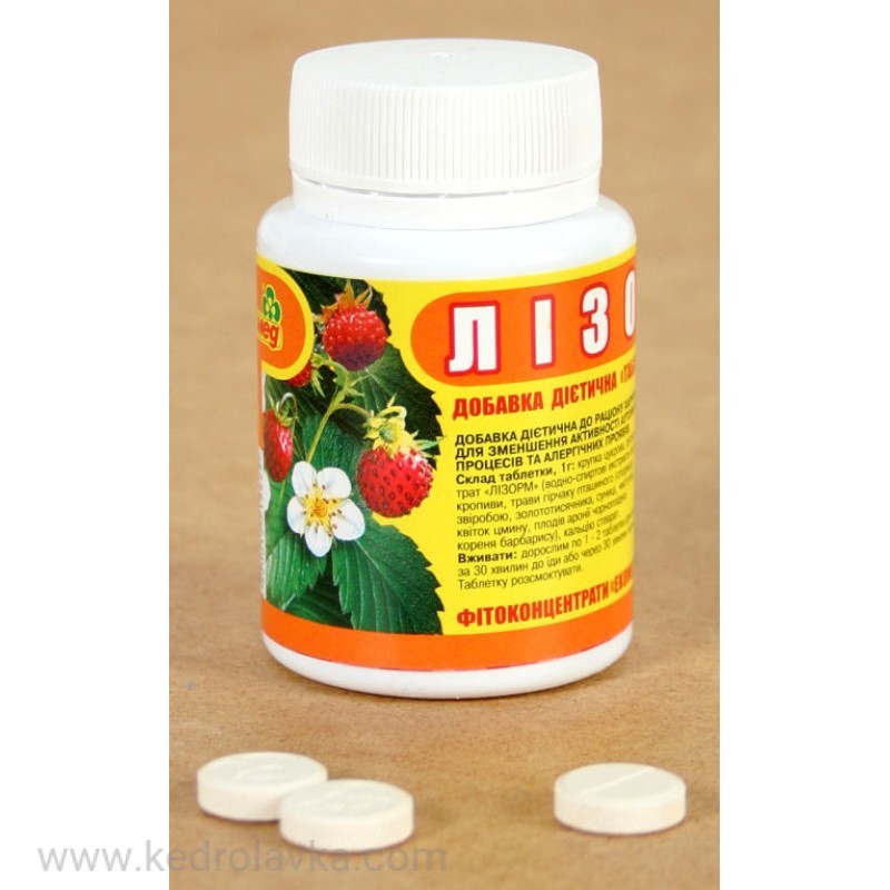 Состав, табл., 1г: крупка сахарная, фитоконцентрат Лизорм (водно-спиртовые экстракты листьев крапивы, травы горчицы птичьего (спорыша), зверобоя, золототысячника, земляники, чистотела, цветков цмину, плодов аронии черноплодной, короды, короды).